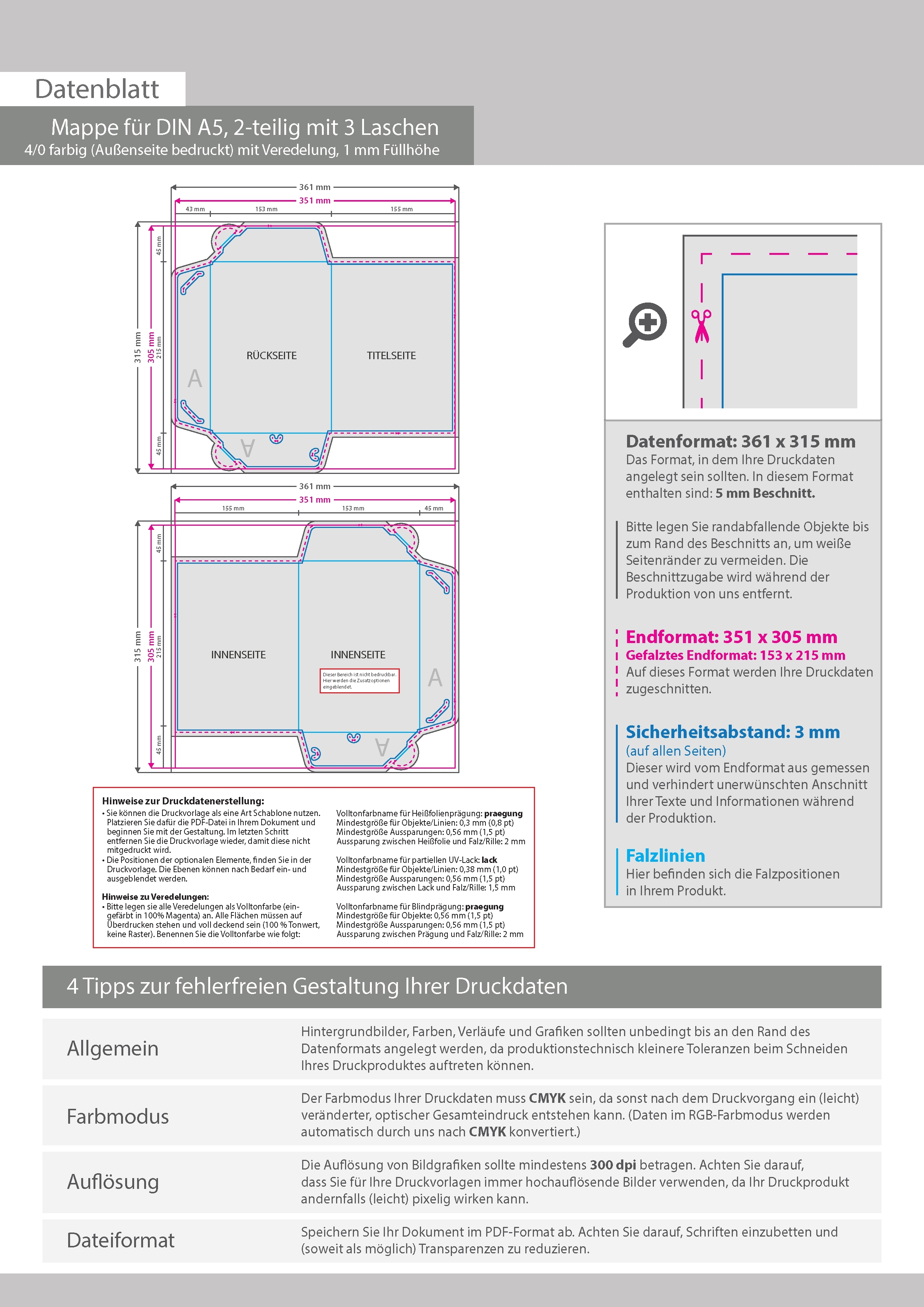 Mappe für DIN A5, 2-teilig mit 3 Laschen, 4/0 farbig (Außenseite bedruckt), mit Softfeel-Folie kaschiert