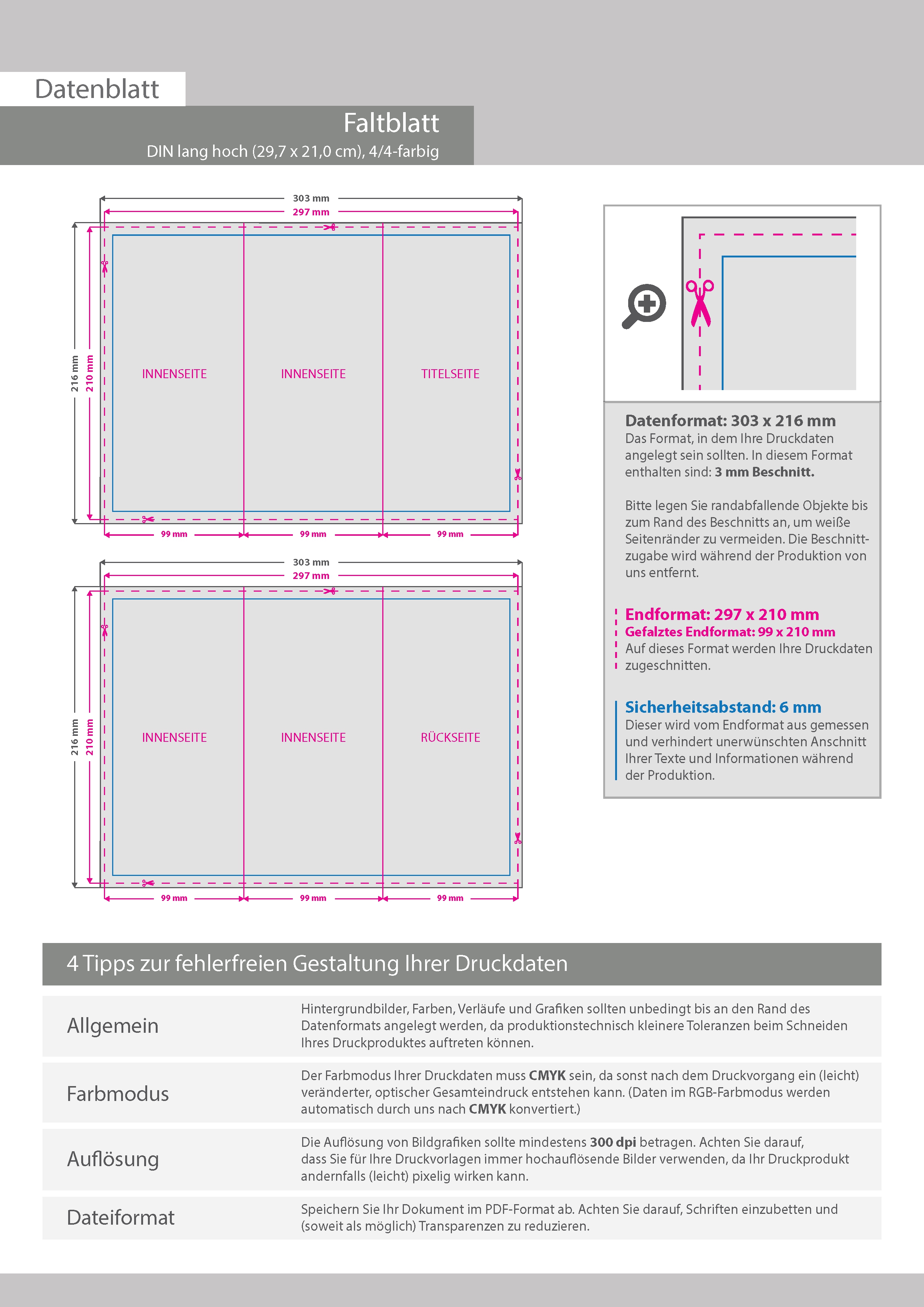 Faltblatt, gefalzt auf DIN lang, 6-seiter (Zickzackfalz)