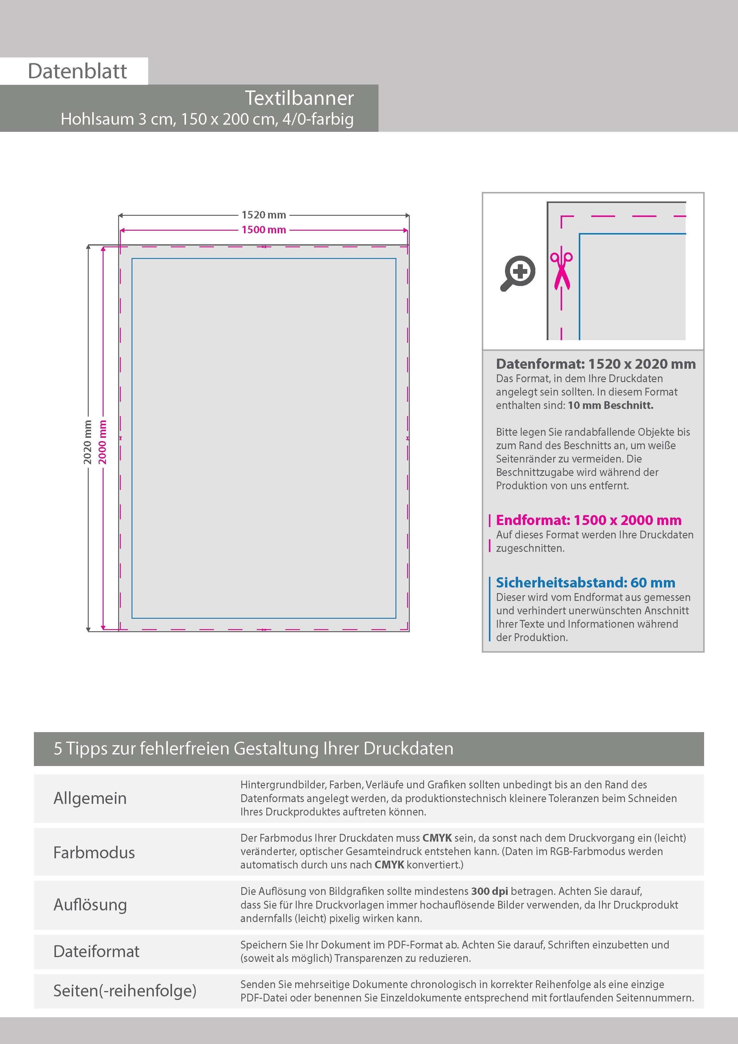 Hochwertige Stoff-Banner 150 x 200 cm, 4/0-farbig bedruckt, Hohlsaum links und rechts (Durchmesser Hohlsaum 3,0 cm)
