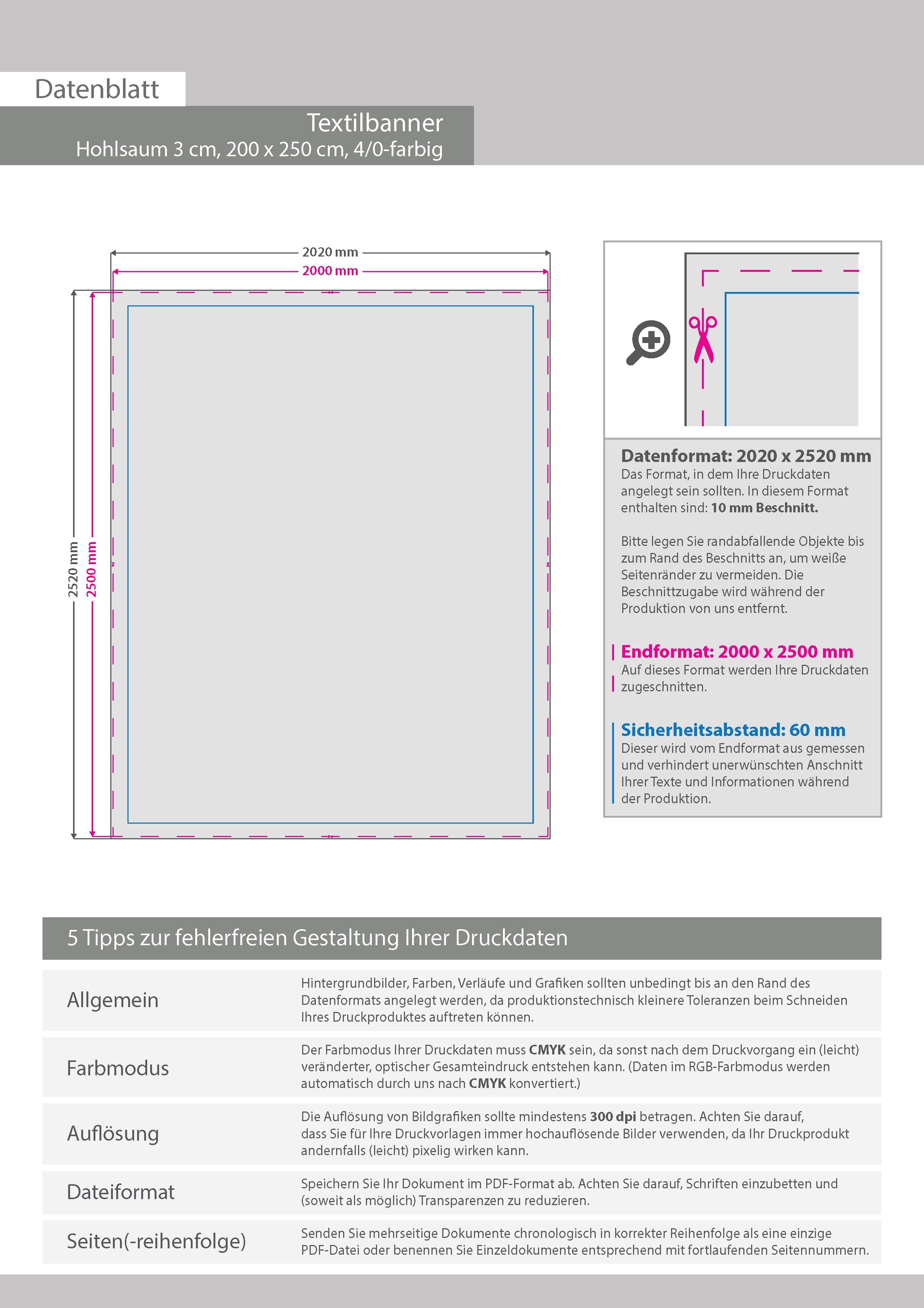 Hochwertige Stoff-Banner 200 x 250 cm, 4/0-farbig bedruckt, Hohlsaum links und rechts (Durchmesser Hohlsaum 3,0 cm)